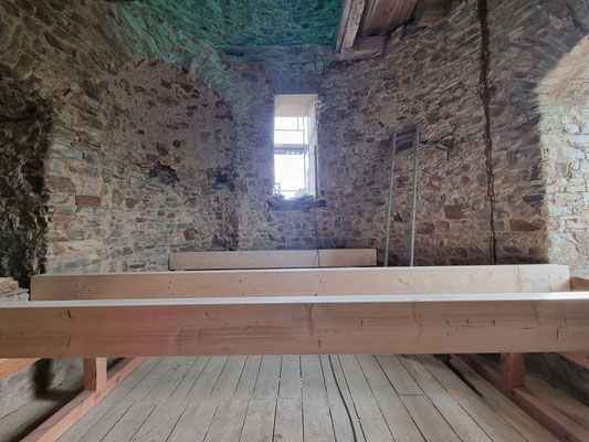 Der Drehkranz auf dem Turm (der sorgt dafür, dass die Windmühlenflügel in den Wind gedreht werden können) ist fertig montiert. Im April wird die Kappe montiert. Außerdem gibt es eine neue Treppe im Turm, damit der Aufstieg etwas bequemer wird.